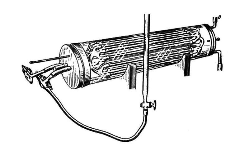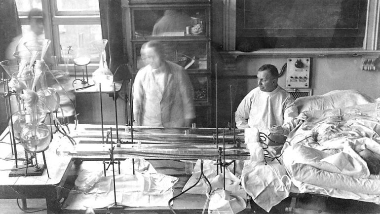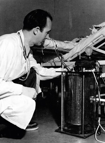 Nils Alwall med en tidig modell av Kiil-dialysatorn, 1946.